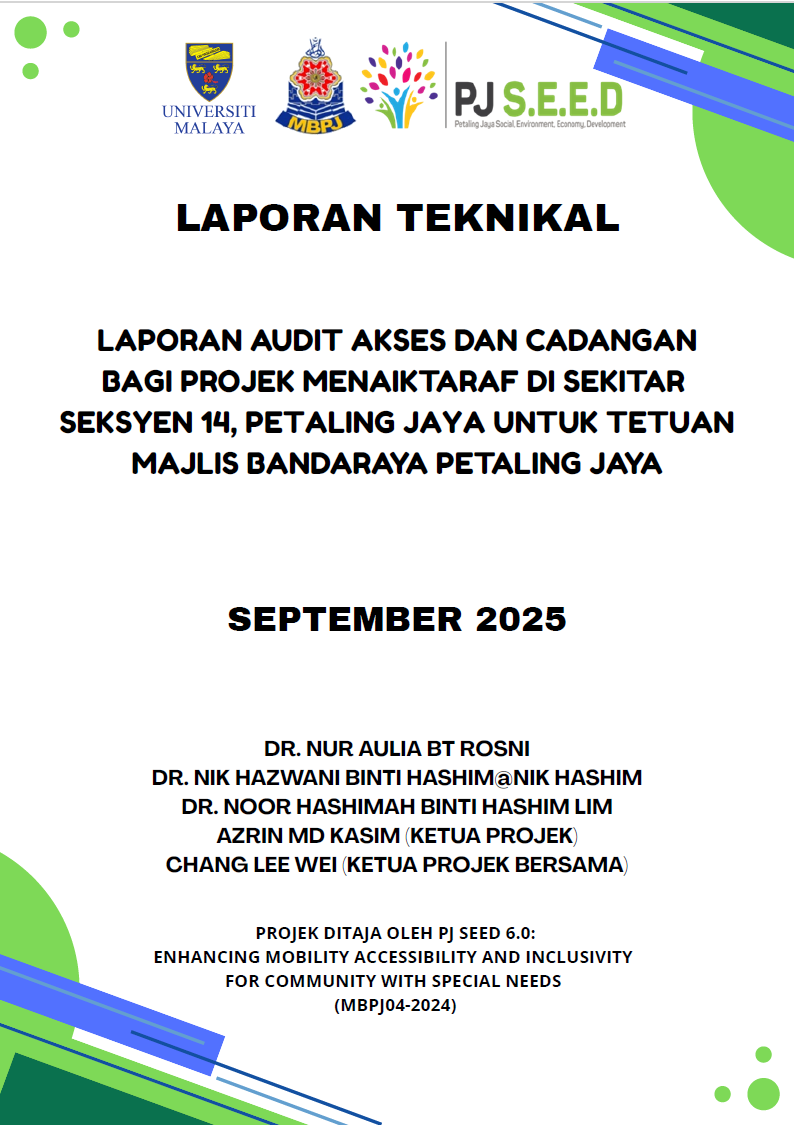 ![]() | Laporan Audit Akses dan Cadangan bagi Projek Menaiktaraf di Sekitar Seksyen 14, Petaling Jaya untuk Tetuan Majlis Bandaraya Petaling Jaya Author(s)/Editor(s): Nur Aulia Rosni, Nik Hazwani Hashim @ Nik Hashim, Noor Hashimah Hashim Lim, Azrin Md Kasim, Chang Lee Wei Year of Publication: 2025 Click here for more information | ||